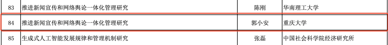12月26日,全国哲学社会科学工作办公室公布了研究阐释党的二十届三中全会精神国家社会科学基金重大专项立项名单。郭小安教授作为首席专家申报的“推进新闻宣传和网络舆论一体化管理研究”获得立项,成为本年度学院获批的第二项国家社科基金重大课题,实现了新的历史性突破。
