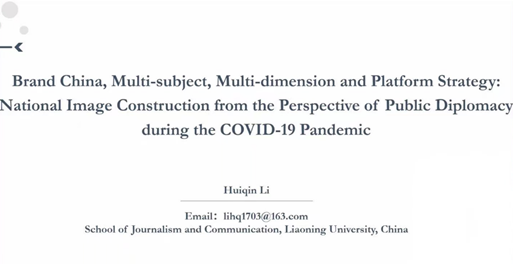 辽宁大学新闻与传播学院硕士生李慧琴以“Brand China, Multi-subject, Multi-dimension and Platform Strategy: National Image Construction from the Perspective of Public Diplomacy during the COVID-19 Pandemic”为题,提出在公共外交视野下,“第六声”建构国家形象的传播策略为我国国家形象构建带来如下启示:第一,向世界说明真实的中国,采用淡色中国策略;第二,多主体讲述中国故事,拓宽中外交流语境的融合空间;第三,“小而美”建构立体、多维的中国形象;第四,多平台吸引“中国观察家”。