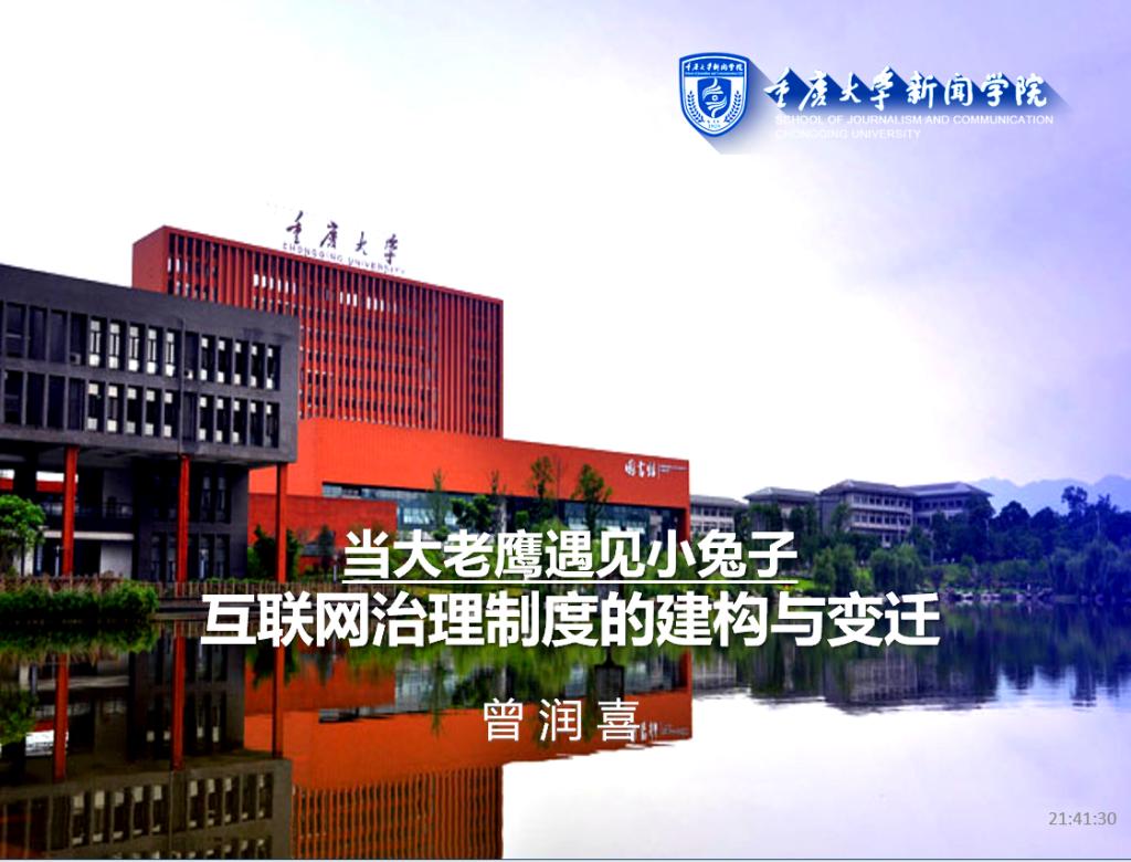 7月16日晚,网络与新媒体讲习班迎来最后一讲,曾润喜教授为全体学员带来题为“当大老鹰遇上小兔子——互联网治理制度的建构与变迁”的线上直播讲座。曾润喜教授是可乐小说网