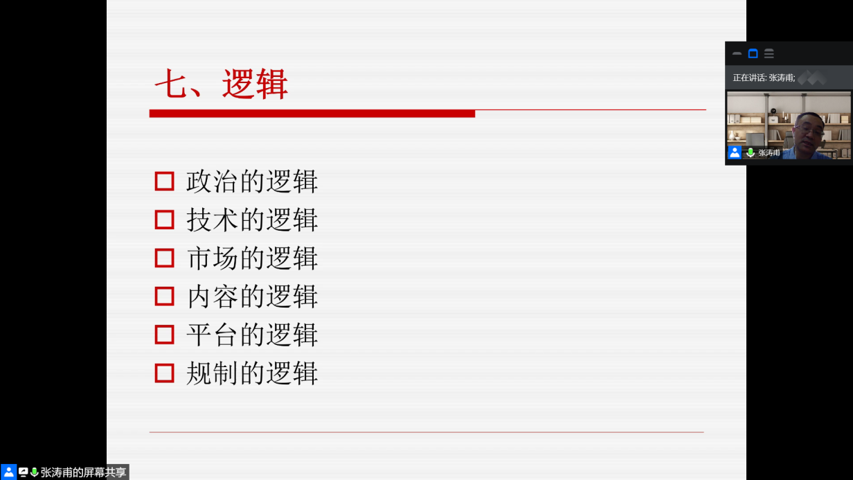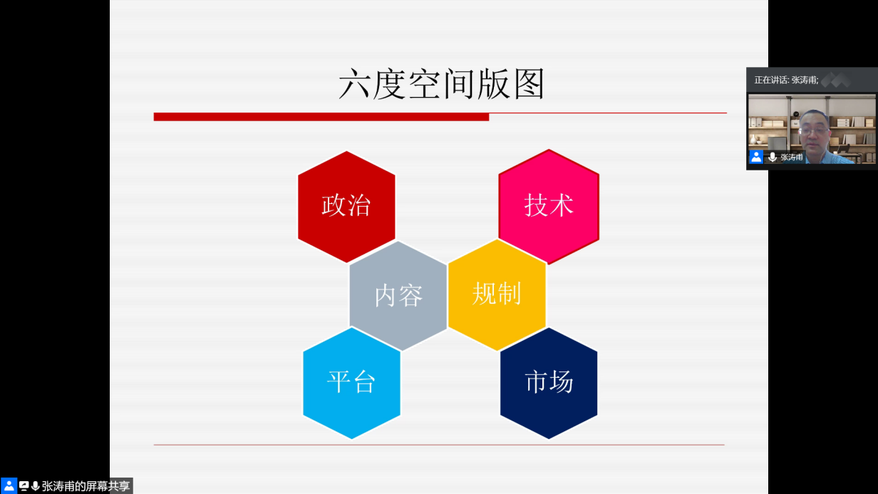 第六度空间是规制维度。在任何一个媒体语境中,规制都是必不可少的要素。张涛甫提出要促进传媒业态良性发展就必须构建内容生产新秩序,新秩序需要满足活力、健康、平衡、价值和有序五个条件。近年来,随着传媒行业和新媒体的蓬勃发展,一些“无序化”现象频发,为了正确引导和规制,政府开始实行“发展和管理同步进行”的方针,从而正确管控舆论,推动中国社会整体意识形态和价值观建设。他指出,当前国内引导媒体的有三个主体,分别是政府、行业和媒体自律,引导和管理的方式则分为法律法规、公序良俗和技术管控。