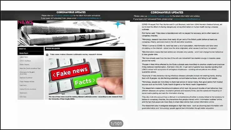 新冠疫情暴发期间,大家亟需真实准确信息而现实传播媒介中却泛滥着各类谣言和虚假信息,这对信息传播伦理是一次前所未有的大考验。以此现实情况为基础,陈昌凤教授将“疫情与虚假新闻”作为引言切入讲座。她介绍了2003年非典后诞生的传播新词汇“信息流行病”即“infodemic”,该词意为一些事实,加上恐惧、猜测和谣言, 被现代信息技术在世界范围内迅速放大和传递,以同根本现实完全不相称的方式影响国家和国际经济、政治甚至安全。17年后的今天,这个词汇在原来的基础上进一步发展成为“disinfodemic”,意味着“信息流行病”的虚假性和严重性更为强烈。陈昌凤教授介绍,东英吉利大学诺威治医学院(The Norwich Medical School at UEA)两位学者Paul Hunter和Julii Brainard研究指出,转发分享危险的错误信息会使疾病的暴发更加迅猛,有力地证实了“信息流行病”对社会的不利影响。