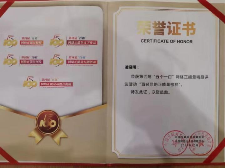 党委书记凌晓明再次获评第四届全国“百名网络正能量榜样” 称号。第四届全国“五个一百”网络正能量精品评选活动是由国家互联网信息办公室指导,中国网络社会组织联合会、中国互联网发展基金会主办,人民网、中国青年网、光明网、中国新闻网、环球网承办。