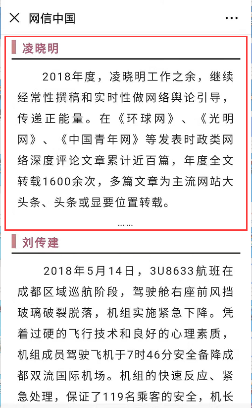 国家互联网信息办公室官微“网信中国”在推广凌晓明的事迹时,这样写道:“2018年度,凌晓明工作之余,继续经常性撰稿和实时性做网络舆论引导,传递正能量。在《环球网》、《光明网》、《中国青年网》等发表时政类网络深度评论文章累计近百篇,年度全文转载1600余次,多篇文章为主流网站大头条、头条或显要位置转载。”