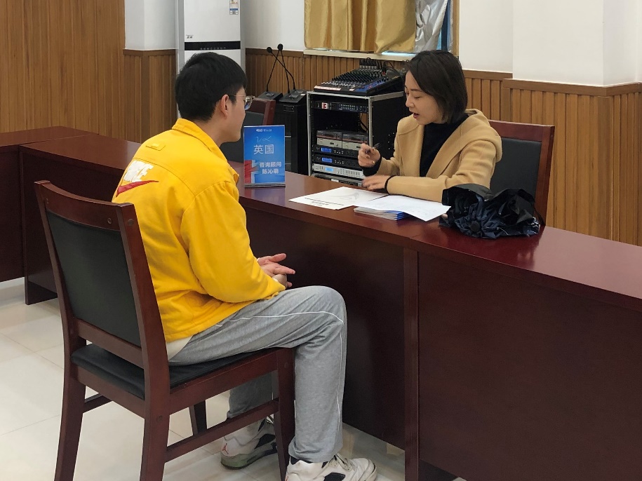 301会议室举行。来自新东方前途出国机构的欧洲部咨询顾问张珩、美研部咨询顾问曾易林和英国部咨询顾问陈沁萌三位老师在现场为同学们答疑解惑,提供一对一的咨询服务。