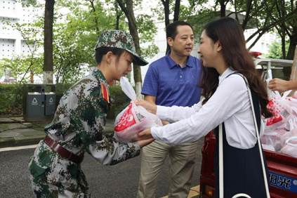随后,龚主任对教官们在训练过程中的辛苦付出表示感谢,并将毛巾、水果等慰问品送到他们手中。18级新生收到慰问品,并纷纷表示,一定会以饱满的热情和精气神圆满完成军训任务。