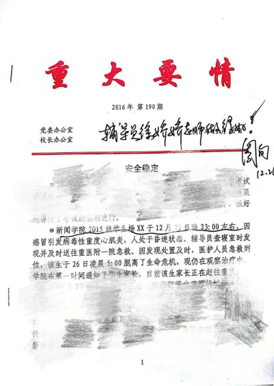 “我查过男生寝后去查女生寝室,路上接到电话说杨庆同学晕倒,就立即转身跑往校医院,说了大致情况后,医生和救护车迅速赶到竹一宿舍,后送到大学城医院,路上告知了魏副书记,并跟学生家长联系,抢救过程中病情严重,需要转院,在跟医生和家属多方协商沟通后,我代签了病危通知书和转院风险承担,并通知她亲姐马上赶到了重医附一,魏副书记凌晨12点多也赶到院。在医生开展急救的焦急等待中,终于听到暂时脱离生命危险的消息。可乐小说网