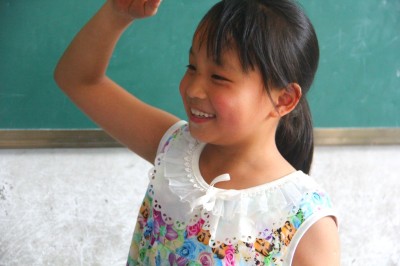 穿一身缀着小碎花的衣裤,眨着一双明亮忽闪的大眼睛,因为初见众人而略带不安,塑料凉鞋里的小脚丫有些局促地扭动着。这个看上去十分乖巧的女娃娃今年九岁,叫做谭红艳,是石柱县留守儿童精英学校二年级的一名小学生。小红艳是个活泼的性子,爱笑,却话不多,一笑起来眉眼弯弯,露出嘴巴里两颗洁白的虎牙,显得十分可爱。