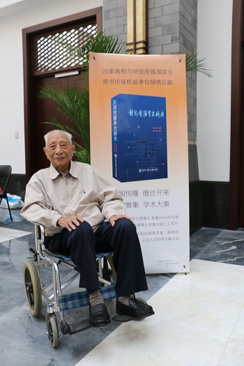 (主编出版国内第一部专业工具书《新闻学大辞典》的甘惜分先生在《新闻传播学大辞典》展示牌前留影)