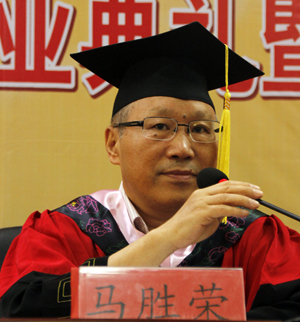 名誉院长马胜荣发表讲话,他首先对出席此次典礼的领导和学生家长表示感谢,随后他谈到了自己来到此次典礼上的心情是“既高兴又感伤的”。一方面是为了同学们结束了学习,拿到了学位感到高兴;另一方面是为时间匆匆逝去,离别不可避免而感到感伤。接着,他与同学们分享了一些诸如哈佛、斯坦福、谢菲尔德等西方著名大学的训言,由此来勉励同学们在毕业后的时间里,也要规划好人生的方向,并为此做出不懈的努力。