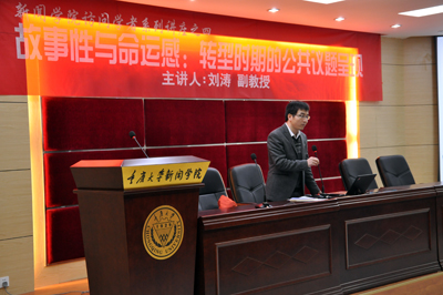 多功能厅举办了“故事性与命运感:转型时期的公共议题呈现”的专题讲座。刘教授曾于2005年6月至2007年6月在CCTV重要节目《新闻调查》担任策划和编导职务。结合自己丰富的实践经验,刘教授向新闻学子分享了自己的从业心得:记者是一个讲好故事的人。