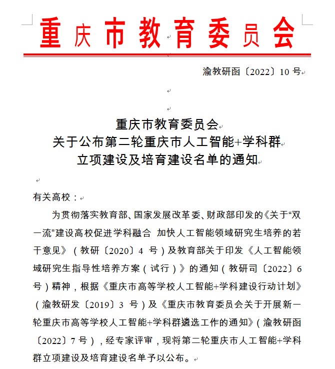 “智能传播”学科群入选第二轮重庆市人工智能+学科群培育建设项目。