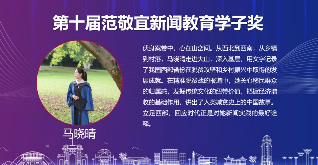 2019级硕士研究生马晓晴荣获范敬宜新闻教育学子奖,2019级本科生王瑞琳荣获范敬宜新闻学子提名奖。