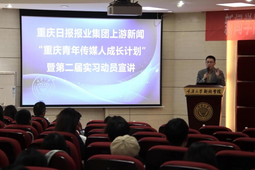 上游新闻编委冯飞详细介绍了“重庆青年传媒人成长计划”项目内容和本次拟招募实习生规模、培训过程、工作要求等,并现场解答了同学们关于实习时长、交通住宿、奖励措施等具体问题,号召学生积极参与第二届“重庆青年传媒人成长计划”,深入主流媒体,了解社会现状,为积极就业打好基础。