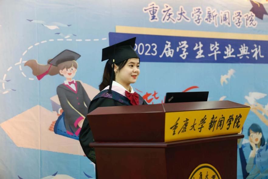 本科毕业生代表赵雨璠同学发言。她回顾了大学四年的学生生活,通过分享自己的亲身经历与同学们共勉大学感悟——在迷茫之际应该着眼于当下,既然一切都是未知数,脚踏实地、立刻去做就是最好的答案。