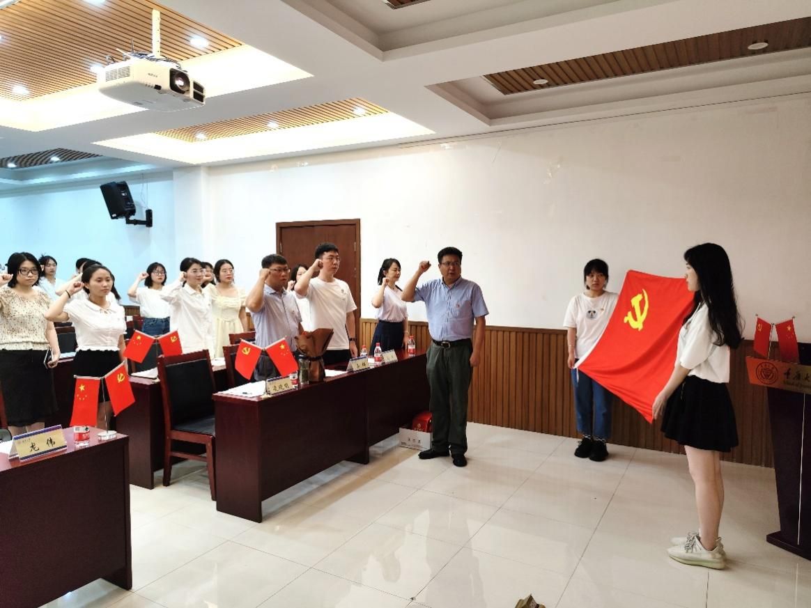 与会党员全体起立并奏唱《国歌》后,在领誓人凌晓明的带领下,新入党党员面对党旗庄严宣誓,与会全体党员共同重温入党誓词。