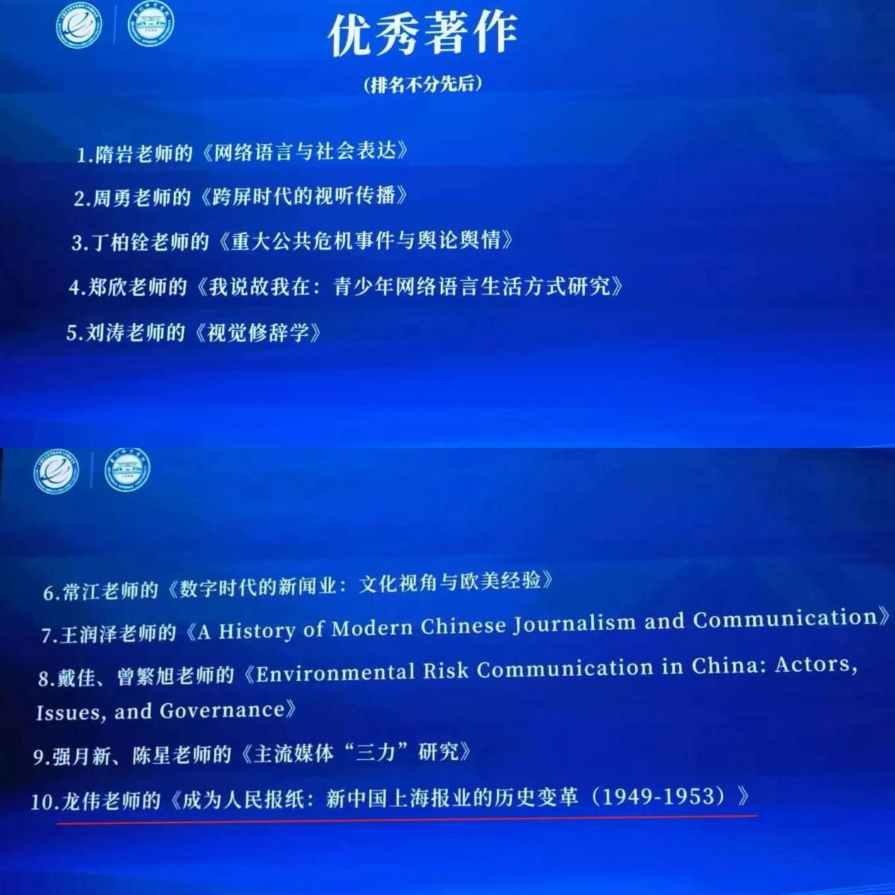 郭小安教授获得2021-2022年度“活跃的学术中坚”奖;龙伟教授的《成为人民报纸:新中国上海报业的历史变革(1949-1953)》获得“优秀著作”奖。可乐小说网