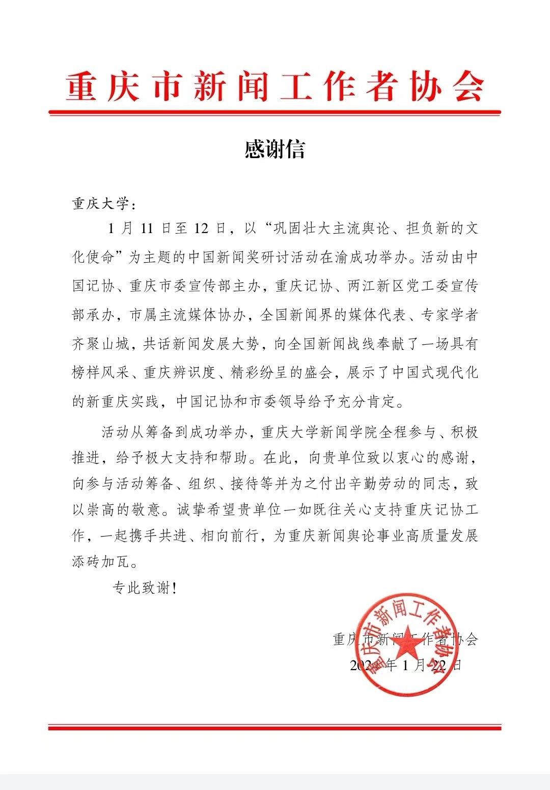 能够一如既往地关心支持重庆记协的工作,携手共进、相向前行,为重庆新闻舆论事业的高质量发展添砖加瓦。