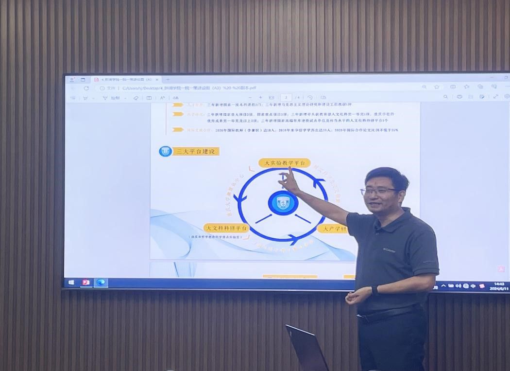 近年来在学科建设、科学研究、文化建设上的取得的成就表示充分肯定。他指出,在规范学院图书分管建设方面,校图书馆会派专门的老师直接参与、对接学院的图书分管工作;在资源共享方面,他表示争取为新闻分馆定期更新一批专业图书、梳理重要学术文献,进一步完善学习出版与知识服务。在毕业论文存档方面,他提出“学院+图书馆”的联合共建思路,强调馆藏服务与云储存服务相结合,实现资源共享。