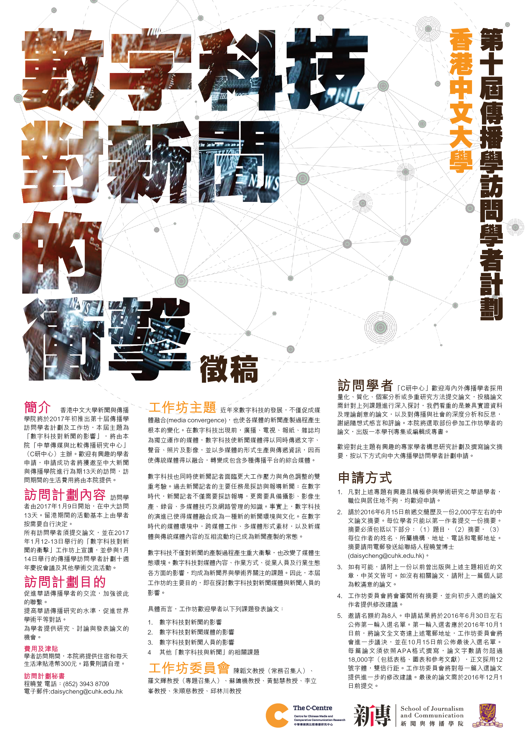 香港中文大学新闻与传播学院将于2017年初推出第十届传播学访问学者计划及工作坊,本届主题为「数字科技对新闻的影响」,将由本院「中华传媒与比较传播研究中心」(C研中心)主办。欢迎有兴趣的学者申请,申请成功者将获邀至中大新闻与传播学院进行为期13天的访问,访问期间的生活费用将由本院提供。
