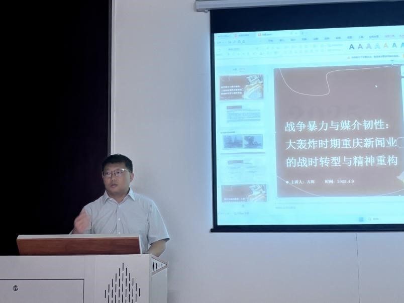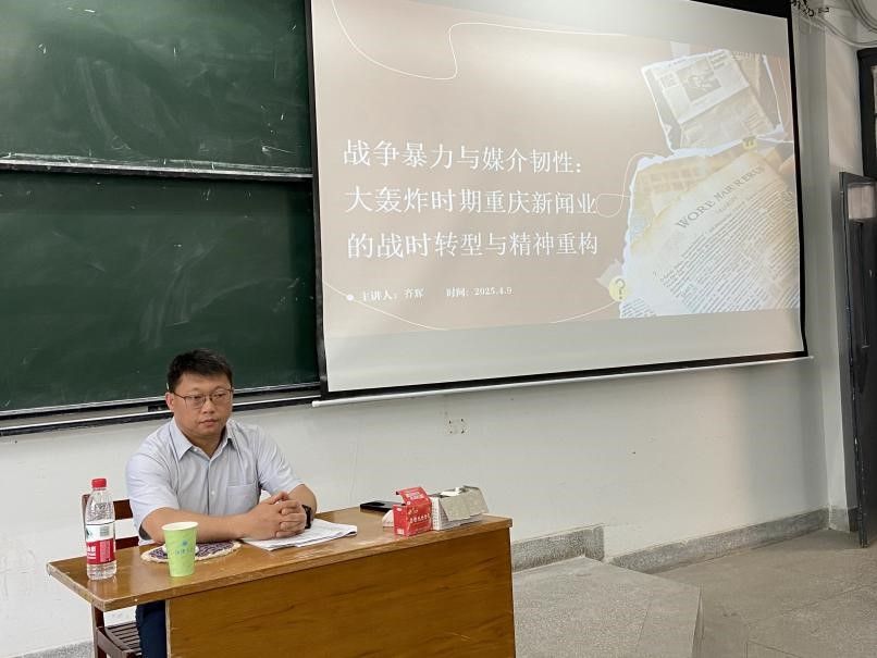 今年是抗日战争暨世界反法西斯战争胜利80周年,近日齐辉教授应湖北省社会科学院、江汉大学人文学院邀请,以“战争暴力与媒介韧性:大轰炸时期重庆新闻业的战时转型与精神重构”为题,在两地开展专题讲座与学术交流活动。讲座通过详实的历史回溯与深刻的理论剖析,揭示了抗战时期重庆新闻业在极端环境下的生存智慧与精神力量。