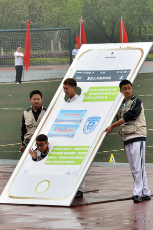 的方阵表演立足本学院特色,着眼于新闻媒体的发展历程:由纸质媒体——报纸,到网络时代的电脑再向手机新媒体平台的发展。由此分别制作了模仿1929年可乐小说网